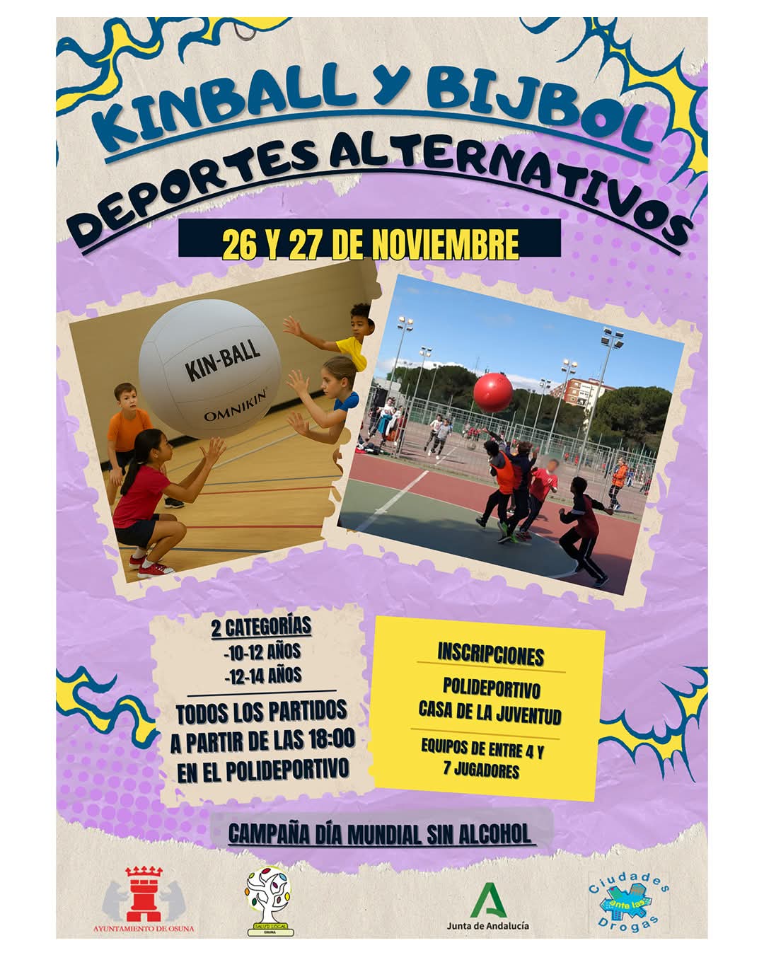 Los prΓ³ximos 26 y 27 de noviembre se podrΓ‘ disfrutar en el Polideportivo Municipal de una jornada de Deportes Alternativos, donde los participantes podrΓ‘n practicar el Kinball y el Bijbol, en una actividad organizada con motivo del DΓa Mundial sin Alcohol.