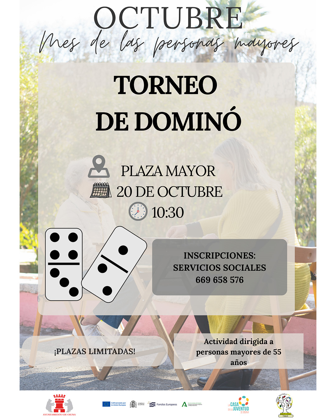 El prΓ³ximo 20 de Octubre tendrΓ‘ lugar un torneo de dominΓ³ en la Plaza Mayor de Osuna, enmarcado en el amplio programa de actividades organizado con motivo del Mes de las Personas Mayores.