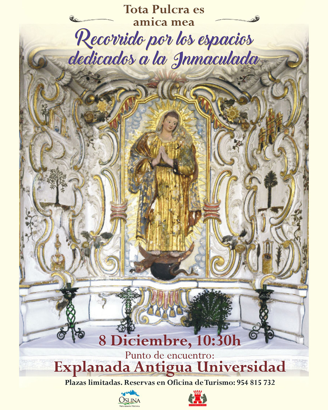 El prΓ³ximo lunes, 8 de diciembre, en conmemoraciΓ³n por el DΓa de la Inmaculada ConcepciΓ³n, la delegaciΓ³n municipal de Turismo del Ayuntamiento de Osuna ha organizado una visita guiada por los espacios dedicados a la Inmaculada.