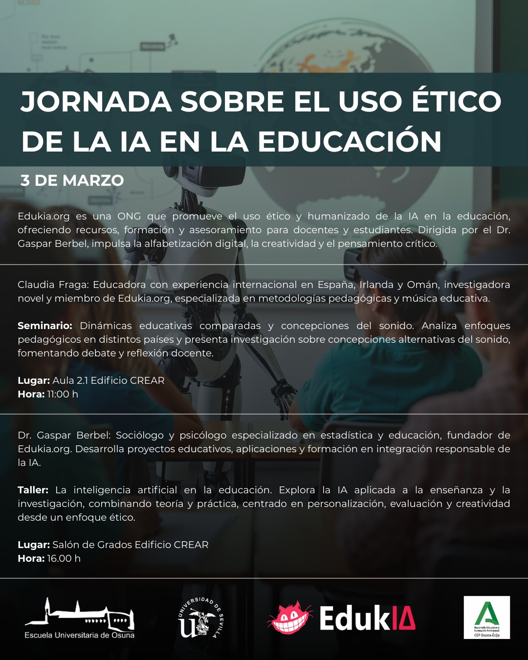 La ONG Edukia organiza una jornada destinada a analizar el ๐—ฝ๐—ฎ๐—ฝ๐—ฒ๐—น ๐—ฑ๐—ฒ ๐—น๐—ฎ ๐—œ๐—ป๐˜๐—ฒ๐—น๐—ถ๐—ด๐—ฒ๐—ป๐—ฐ๐—ถ๐—ฎ ๐—”๐—ฟ๐˜๐—ถ๐—ณ๐—ถ๐—ฐ๐—ถ๐—ฎ๐—น (๐—œ๐—”) ๐—ฒ๐—ป ๐—น๐—ฎ ๐—ฒ๐—ฑ๐˜‚๐—ฐ๐—ฎ๐—ฐ๐—ถรณ๐—ป desde una perspectiva รฉtica y responsable. Este encuentro contarรก con la participaciรณn de ๐—ฟ๐—ฒ๐—ฐ๐—ผ๐—ป๐—ผ๐—ฐ๐—ถ๐—ฑ๐—ผ๐˜€ ๐—ฒ๐˜…๐—ฝ๐—ฒ๐—ฟ๐˜๐—ผ๐˜€ que compartirรกn conocimientos, experiencias y buenas prรกcticas en el รกmbito educativo.