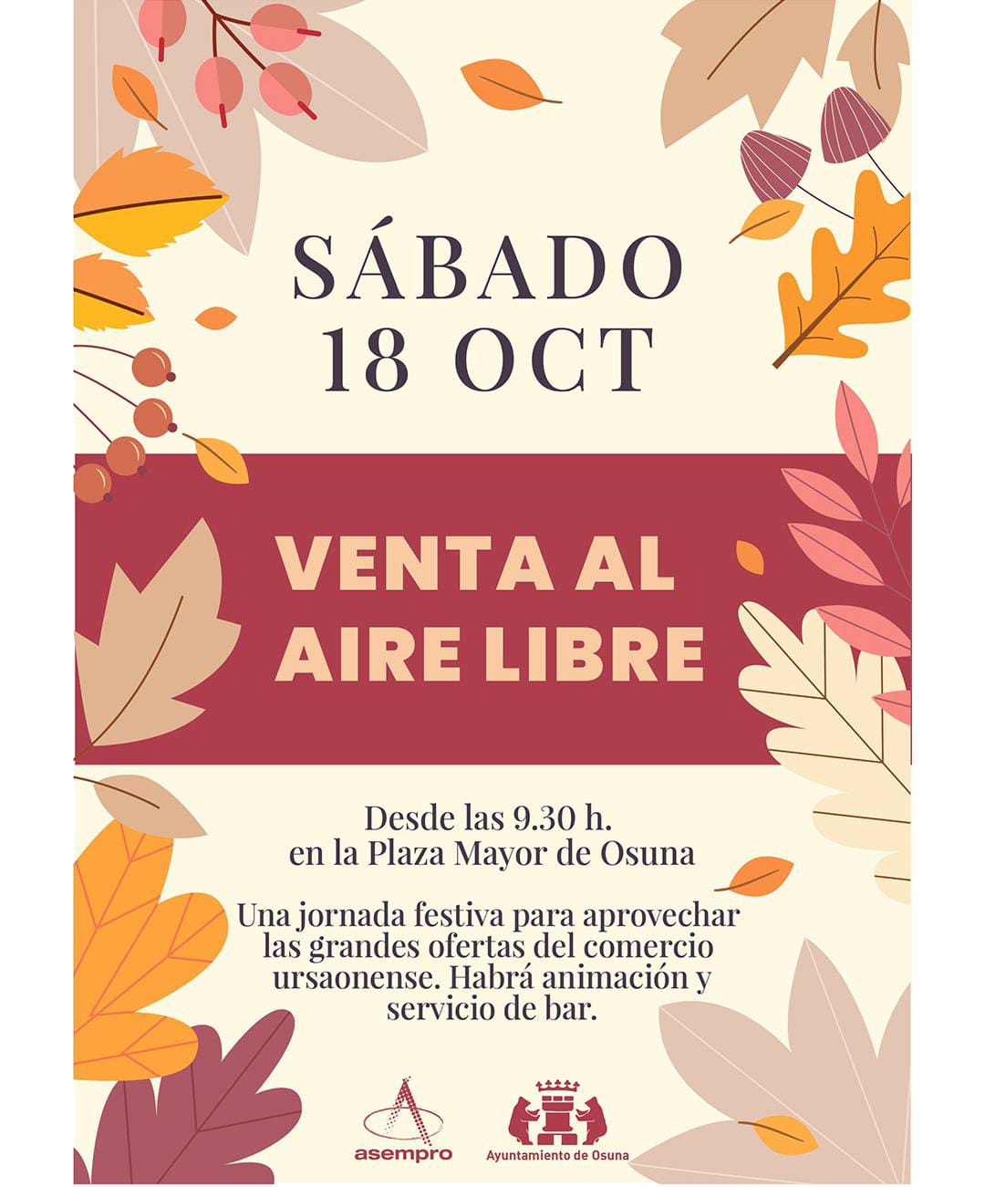 El Sábado 18 de Octubre vuelve una nueva edición de la Venta al Aire Libre a la Plaza Mayor de Osuna. Está organizada por la Asociación de Empresarios y Comerciantes de Osuna (Asempro) con la colaboración del Ayuntamiento y contará con numerosos comercios de nuestra localidad ofreciendo sus mejores productos a precios extraordinarios.