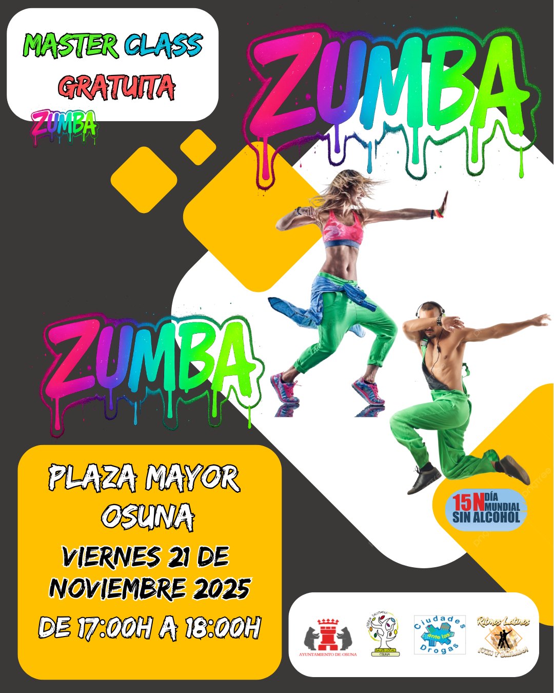 Con motivo del DΓa Mundial sin Alcohol, la Plaza Mayor de Osuna acogerΓ‘ el viernes 21 de noviembre una master class gratuita de zumba.