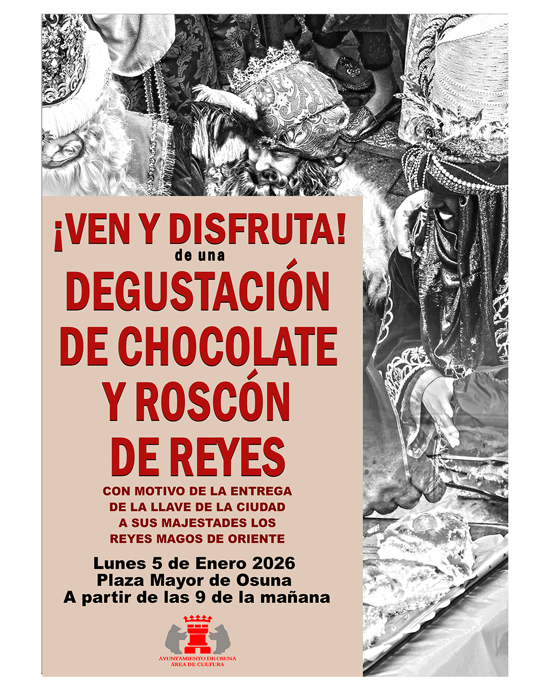 Mientras esperamos la entrada de los Reyes Magos de Oriente en la Villa Ducal, donde, a las puertas del Ayuntamiento, la alcaldesa de Osuna les har谩 entrega de las llaves de la ciudad, podremos disfrutar de 饾槀饾椈饾棶 饾棸饾椀饾椉饾棸饾椉饾椆饾棶饾榿饾棶饾棻饾棶 y del t铆pico 饾棩饾椉饾榾饾棸贸饾椈 饾棻饾棽 饾棩饾棽饾槅饾棽饾榾, tradicional de este d铆a, en la 饾棧饾椆饾棶饾槆饾棶 饾棤饾棶饾槅饾椉饾椏 a partir de las 饾煹 饾棻饾棽 饾椆饾棶 饾椇饾棶帽饾棶饾椈a.