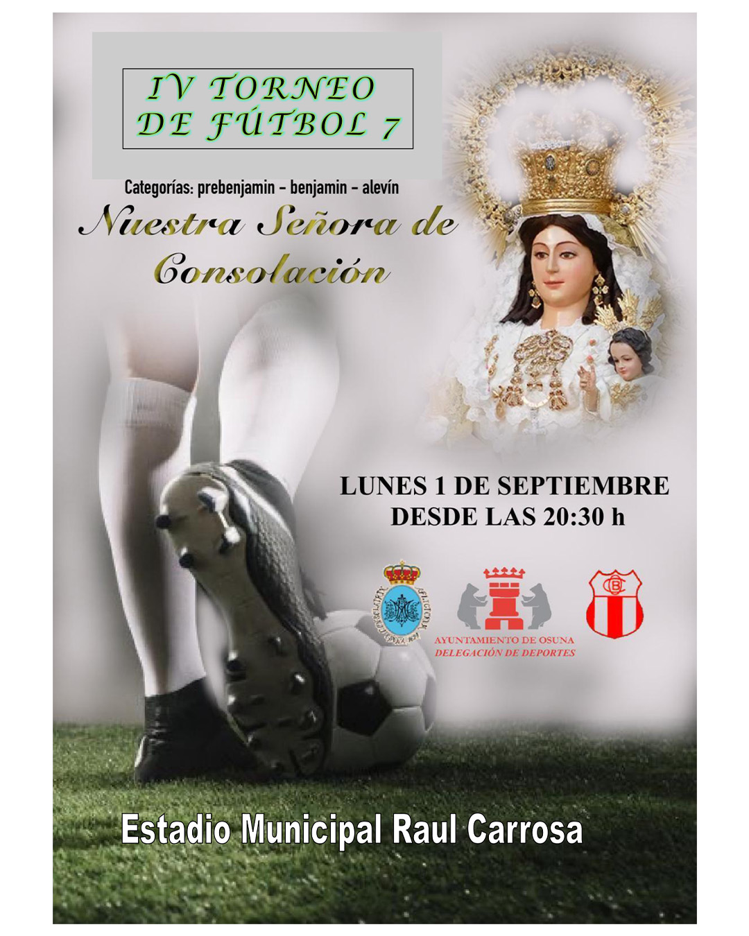 IV CAMPEONATO DE FÚTBOL 7 NTRA SEÑORA DE CONSOLACIÓN El Estadio Municipal de Deportes Raúl Carrosa acogerá el próximo lunes, 1 de septiembre, el IV Campeonato de Fútbol 7 Nuestra Señora de Consolación. Lunes 1 de septiembre 20:30 h. Estadio Municipal de Deportes Raúl Carrosa BuscarBuscar Noticias Recientes Fondos europeos transferidos al Gobierno de la Nación posibilitan la bioclimatización y energía fotovoltaica en el IES Sierra Sur El Hospital de la Merced es ya hospital universitario tras su reconocimiento, impulsado por el Ayuntamiento de Osuna y la Universidad de Sevilla Rafaelillo, Antonio Ferrera y Curro Díaz, quienes lidiarán toros de Victorino Martín, componen el cartel de la Feria de Mayo 2024 Presentado el cartel anunciador de la Feria de Osuna 2024, obra de José Miguel Morales La alcaldesa de Osuna y el diputado de Servicios Públicos Supramunicipales inauguran el Parque Periurbano La Quinta Archives mayo 2024 abril 2024 noviembre 2023 marzo 2023 junio 2022 Categories Actualidad Sin categorizar