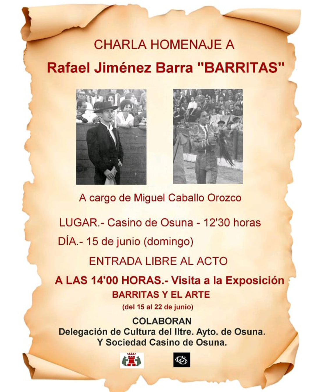 El Casino de Osuna acogerá el próximo domingo, 15 de junio, la charla homenaje a Rafael Jiménez Barra «Barritas», a cargo de Miguel Caballo.