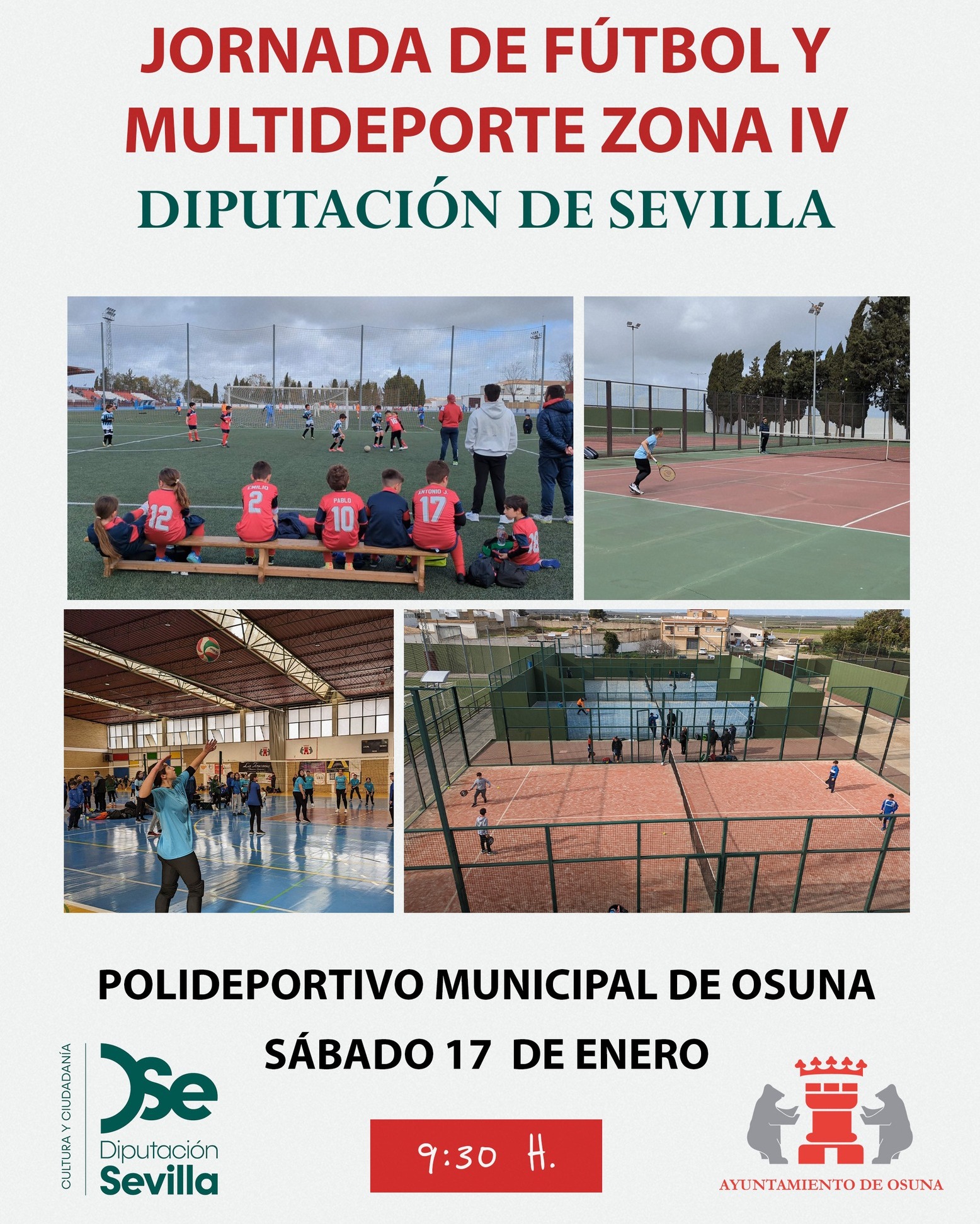 ⚽🎾🏀 𝗝𝗢𝗥𝗡𝗔𝗗𝗔 𝗙Ú𝗧𝗕𝗢𝗟 𝗬 𝗠𝗨𝗟𝗧𝗜𝗗𝗘𝗣𝗢𝗥𝗧𝗘 𝗗𝗜𝗣𝗨𝗧𝗔𝗖𝗜Ó𝗡 𝗗𝗘 𝗦𝗘𝗩𝗜𝗟𝗟𝗔 Mañana sábado, 17 de enero, desde las 9:30 h. el Polideportivo Municipal de Osuna acogerá una jornada de fútbol y multideporte de la Zona IV de la Diputación de Sevilla. Sábado 17 de enero. 9:30 h. Polideportivo Municipal de Osuna BuscarBuscar Noticias Recientes Osuna afronta el Puente de la Inmaculada con excelentes previsiones turísticas y un completo programa navideño Osuna se une a la App SetJetters: Descubre los escenarios de cine en el destino Lo nuevo de Bayona se rueda en este encantador pueblo de Sevilla: Osuna El Teatro Municipal Álvarez Quintero acogerá el espectáculo «Credo» de Cantores de Híspalis Guía para la Solicitud de Rodajes en Osuna Archives diciembre 2025 noviembre 2025 enero 2025 mayo 2024 abril 2024 enero 2024 noviembre 2023 marzo 2023 junio 2022 julio 2019 abril 2019 marzo 2019 Categories Actualidad Patrimonio y Cultura Sin categoría Sin categorizar Turismo de Cine
