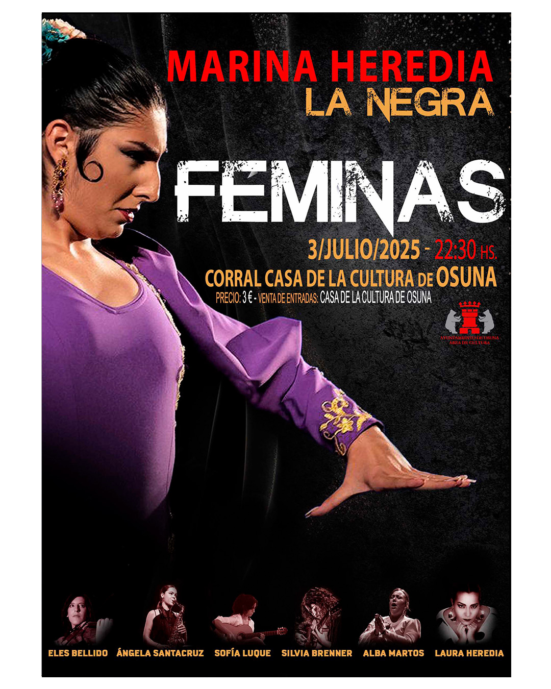 La Casa de la Cultura de Osuna acogerá el próximo 3 de julio el espectáculo Féminas de Marina Heredia «La Negra», donde se rinde homenaje al arte, la fuerza y el duende de la mujer en el flamenco.