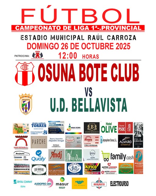 El Domingo 26 de Octubre a las 12:00 h. el Osuna Bote Club disputará la octava jornada de la liga enfrentándose al U.D. Bellavista en el Estadio Municipal de Deportes Raúl Carrosa.