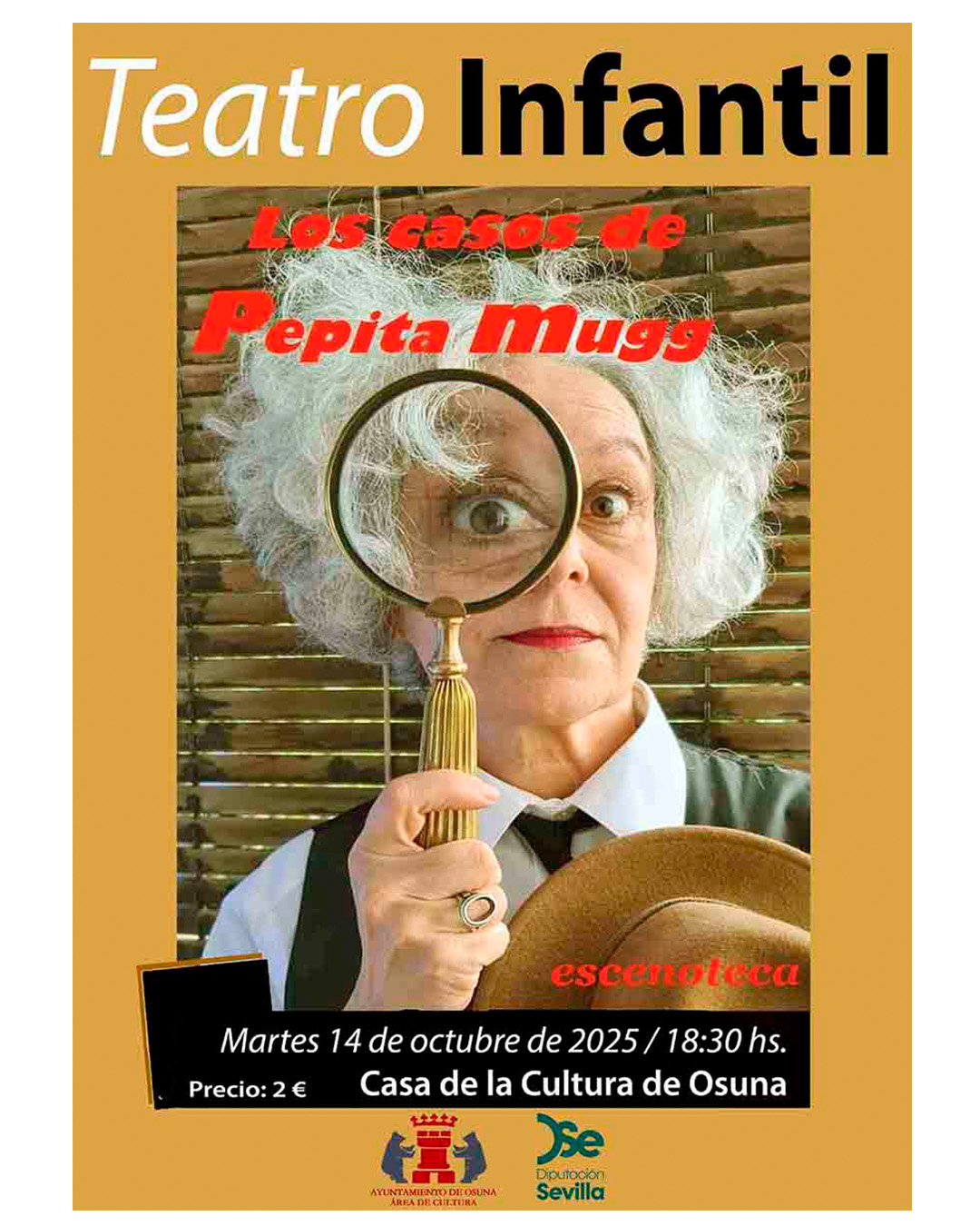 El 14 de octubre se podrá disfrutar de «𝗟𝗼𝘀 𝗰𝗮𝘀𝗼𝘀 𝗱𝗲 𝗣𝗲𝗽𝗶𝘁𝗮 𝗠𝘂𝗴𝗴», un divertido espectáculo infantil donde la intrépida detective Pepita Mugg invita a los niños y niñas a ayudarla a resolver misteriosos casos. Con humor, pistas y mucha participación, el público se convierte en protagonista de la investigación.