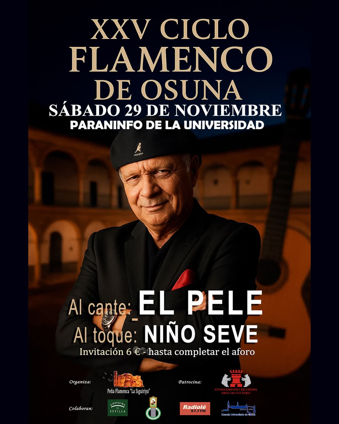 El sábado 29 de noviembre en el Paraninfo de la Antigua Universidad finalizará el XXV Ciclo Flamenco de Osuna con la actuación de El Pele, quien estará acompañado por Niño Seve a la guitarra.
