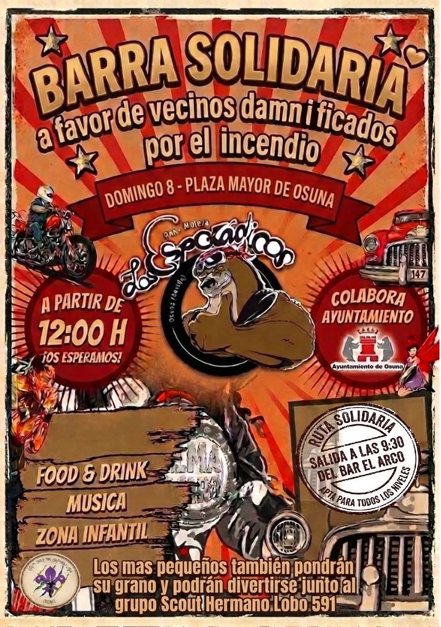 El próximo domingo 8 de marzo, la Peña Motera Los Esporádicos, con la colaboración del Ayuntamiento de Osuna, organizará una 𝗯𝗮𝗿𝗿𝗮 𝘀𝗼𝗹𝗶𝗱𝗮𝗿𝗶𝗮 𝗲𝗻 𝗹𝗮 𝗣𝗹𝗮𝘇𝗮 𝗠𝗮𝘆𝗼𝗿 de Osuna a partir de las 12:00 h, cuya recaudación íntegra irá destinada a la 𝗳𝗮𝗺𝗶𝗹𝗶𝗮 𝗮𝗳𝗲𝗰𝘁𝗮𝗱𝗮 recientemente por el 𝗶𝗻𝗰𝗲𝗻𝗱𝗶𝗼 𝗱𝗲 𝘀𝘂 𝘃𝗶𝘃𝗶𝗲𝗻𝗱𝗮.