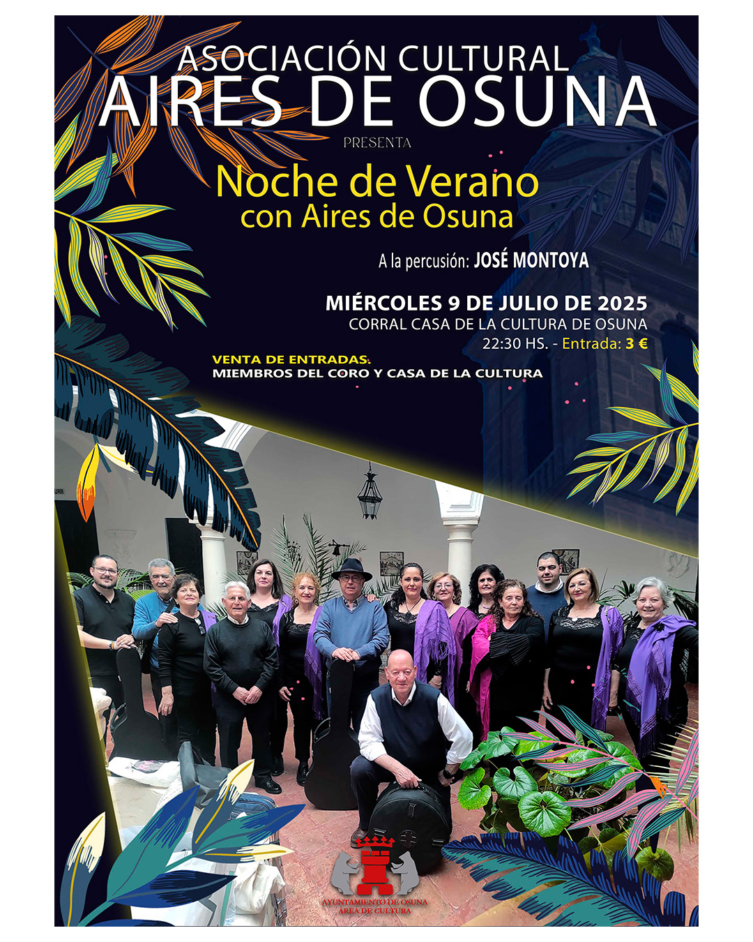 La Asociación Cultural Aires de Osuna ha organizado el espectáculo Noches de Verano, del que se podrá disfrutar el próximo miércoles 9 de julio en el Corral de la Casa de la Cultura.