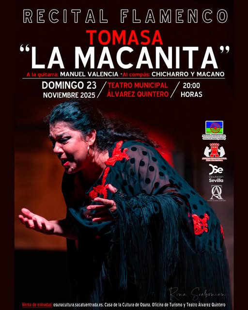 El Domingo 23 de Noviembre, las tablas del Teatro Municipal Álvarez Quintero volverán a rebosar de arte con el recital flamenco de Tomasa «La Macanita», quien estará acompañada por la guitarra de Manuel Valencia y el compás de Chicharro y Macano.