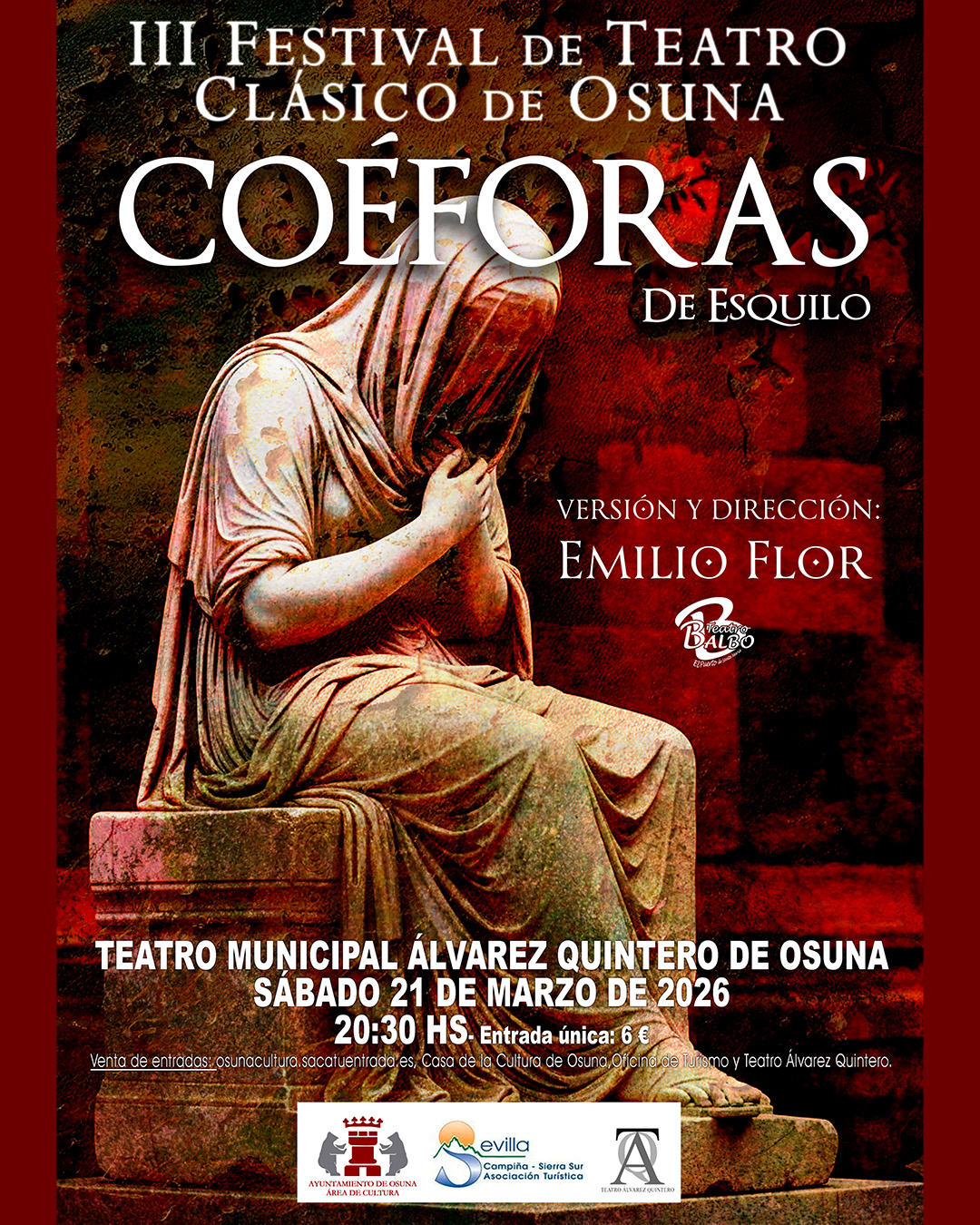 El Teatro Municipal Álvarez Quintero acogerá el sábado 21 de marzo el III Festival de Teatro Clásico de Osuna, que presentará la tragedia griega Coéforas, de Esquilo.