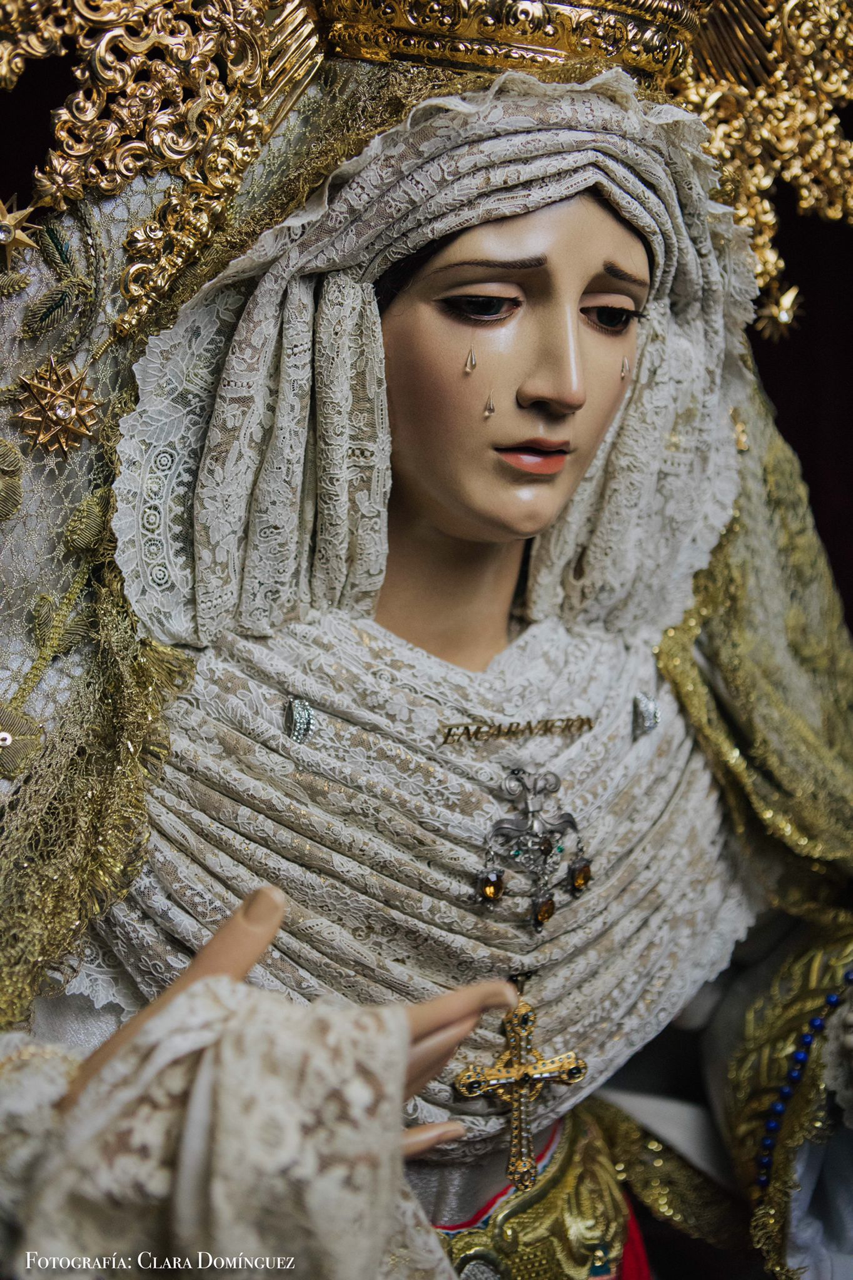 Aspectos destacables de María Stma. de la Encarnación, son la Saya en terciopelo burdeos bordado en oro y el Manto en terciopelo azul imperial con encaje de concha, así como el Fajín de Corbatín en cristal de Swarovski, maya de plata y perlas.