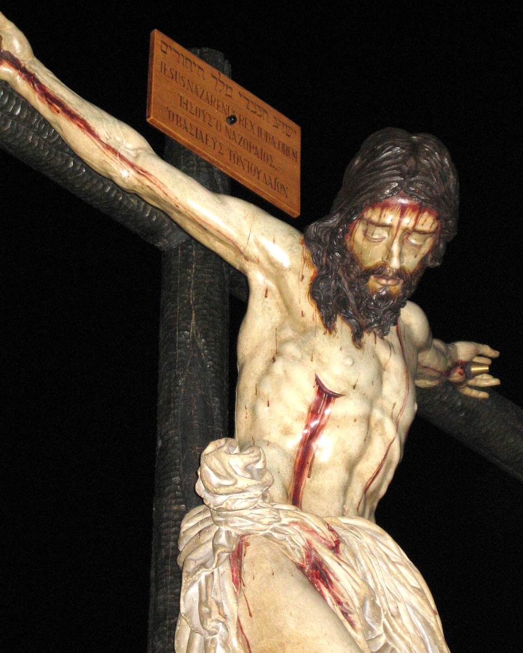 El Cristo de la Paz es de talla gótica que data del siglo XVI de autor anónimo. La imagen representa a Cristo muerto con la cabeza desplomada sobre el lado derecho. Es un crucificado de marcado trazado triangular al estar sujeto a la cruz por tres clavos. La Virgen del Mayor Dolor, es una escultura completa de bellísimo rostro, también de autor desconocido; tiene una policromía muy nacarada.